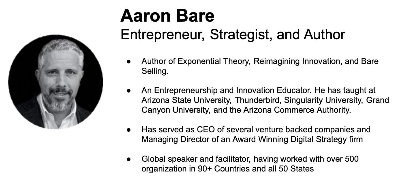 Aaron has also been an EIR at ASU WP Carey School of Business, ASU Fulton School of Engineering, Thunderbird School of Global Management, Center for Entrepreneurial Innovation, and Arizona Commerce Authority. He is currently working with an X-Prize winning mask. He has launched a venture equity/consulting firm to accelerate ideas. Finally, he advises C-Suite, startup founders, private equity, venture capital, and family offices on the future of business and exponential theory.